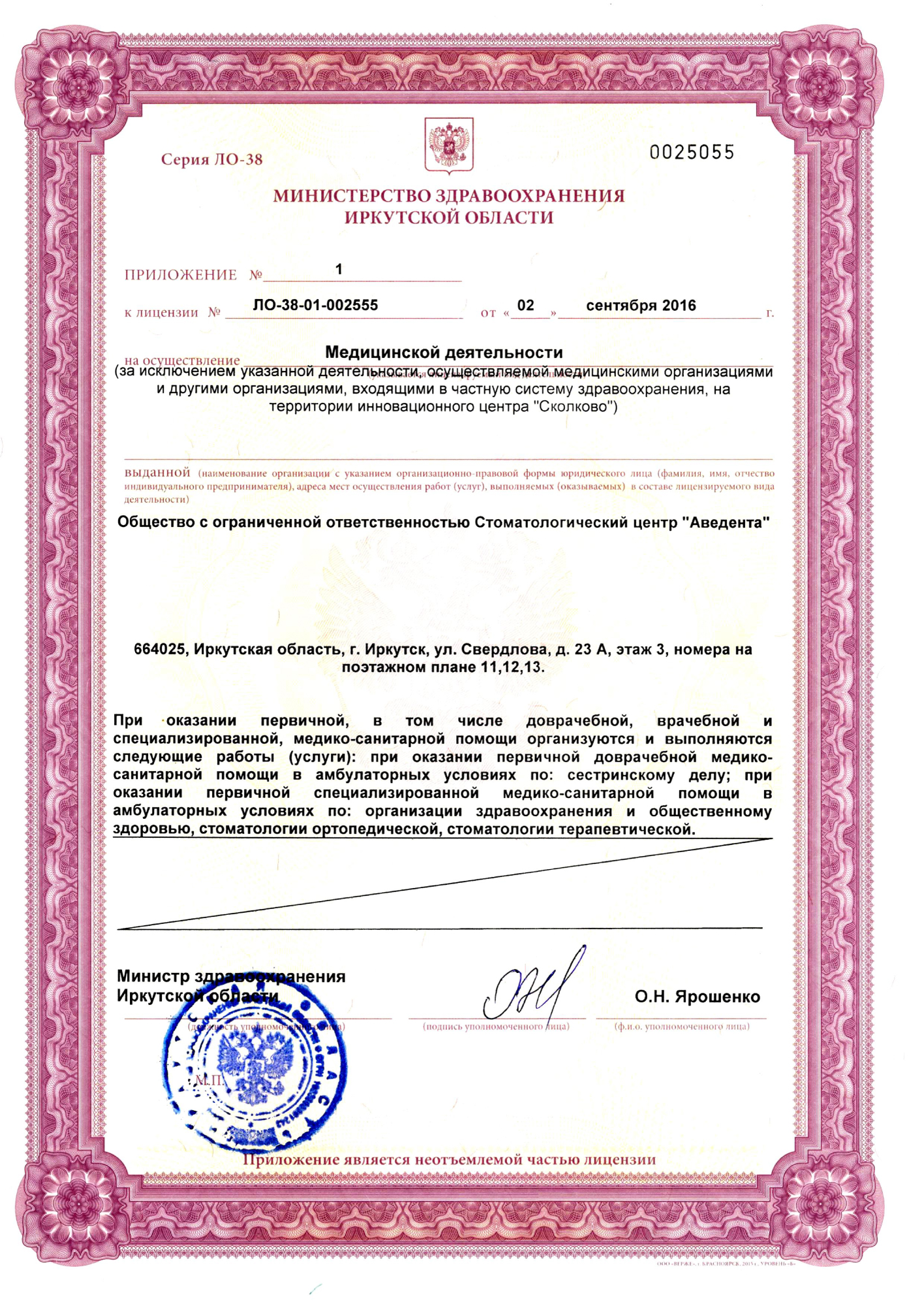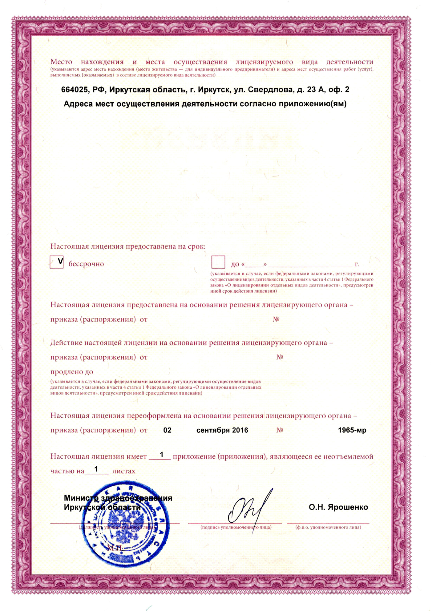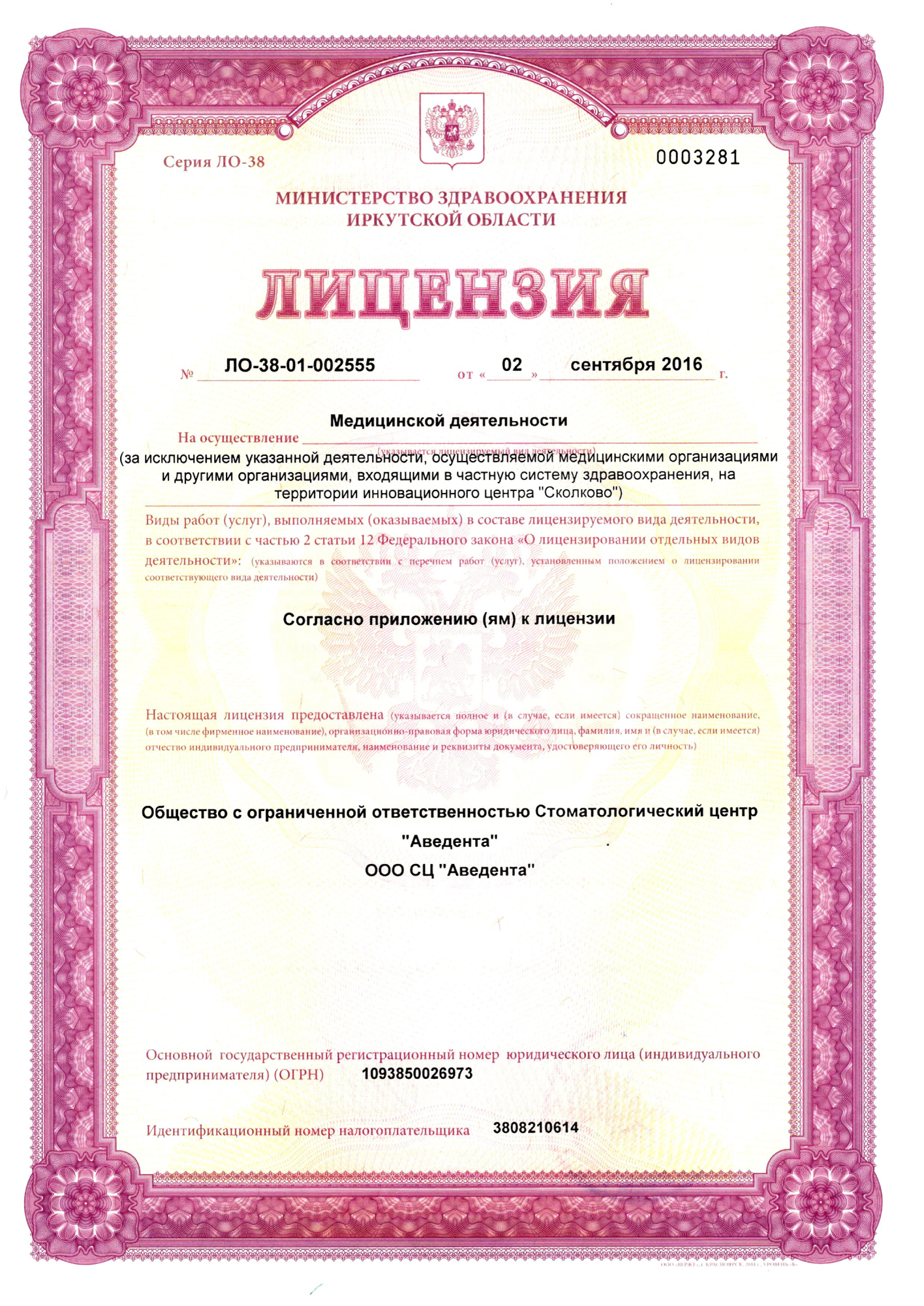 Лицензия на осуществление медицинской деятельности №ЛО-38-01-002555 от 02.09.2016 г.